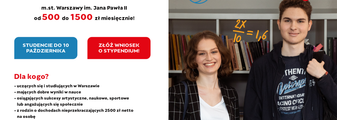 Trwa nabór wniosków o stypendia m.st. Warszawy im. Jana Pawła II dla studentów. Od 1 września do 10 października 2023 studenci warszawskich uczelni – zarówno publicznych, jak i prywatnych – mogą ubiegać się o stypendia m.st. Warszawy im. Jana Pawła II. Stypendia trafią do osób, które oprócz dobrych wyników w nauce mogą pochwalić się sukcesami artystycznymi, naukowymi, sportowymi lub zaangażowaniem w działalność społeczną.