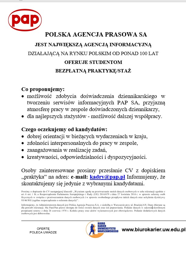 Zachęcamy studentów do zapoznania się z załączonymi ofertami stażu w PAP.