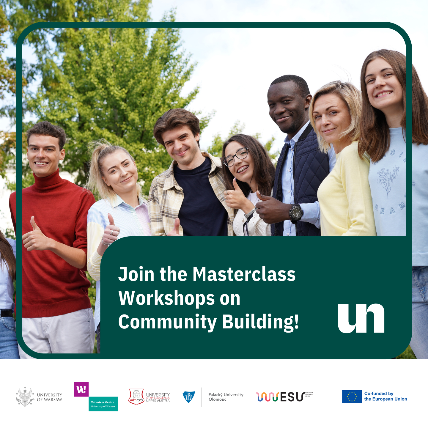 Dołącz do Masterclass Workshops on Community Building organizowanych przez Uniwersyteckie Centrum Wolontariatu w ramach międzynarodowego projektu UNICOMM. Zgłoś się do projektu i zostań częścią różnorodnego i pełnego motywacji zespołu, który będzie miał realny wpływ na rozwój społeczności uczelni!