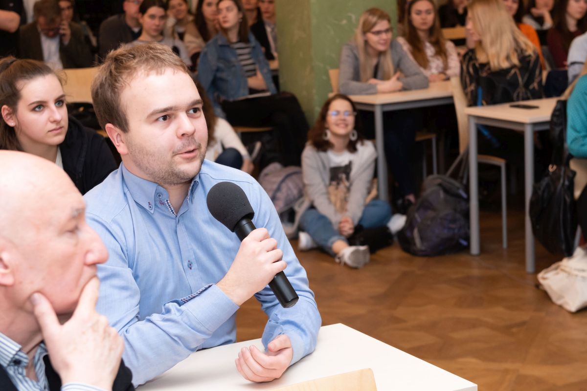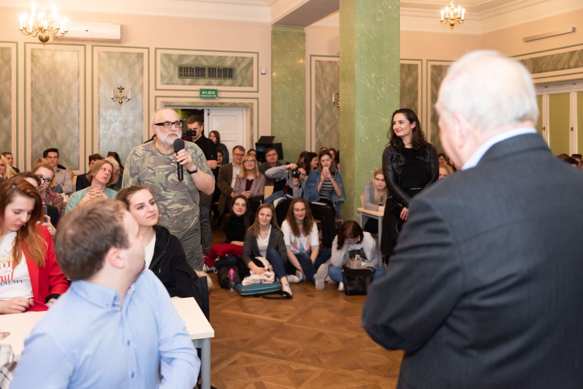 W czwartek 4 kwietnia odbyło się spotkanie z prof. Jerzym Stuhrem, które poprowadził red. Stanisław Zawiśliński. Profesor opowiadał o swoich najnowszych produkcjach, o aktorstwie - jego blaskach i cieniach i o trudach jakie musiał pokonać aby stać się wybitnym aktorem i reżyserem. Chętnie odpowiadał na nurtujące uczestników spotkania pytania, dał też kilka rad i wskazówek czym się kierować w życiu, aby nie zatracić swojej tożsamości i indywidualizmu.