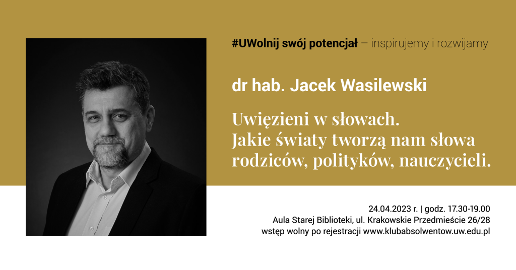"Uwięzieni w słowach. Jakie światy tworzą nam słowa rodziców, polityków, nauczycieli." To kolejne spotkanie z cyklu "#UWolnij swój potencjał – inspirujemy i rozwijamy" organizowanego przez Klub Absolwentów Uniwersytetu Warszawskiego.