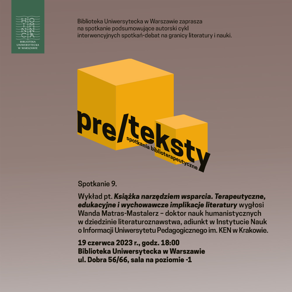 Zapraszamy na dziewiąte, ostatnie spotkanie w ramach cyklu „Pre/teksty. Spotkania biblioterapeutyczne”, które odbędzie się w poniedziałek 19 czerwca 2023 r. o godz. 18.00 w BUW (sala widowiskowa na poziomie -1). W ramach spotkania, które będzie miało charakter podsumowujący cykl, wykład pt. „Książka narzędziem wsparcia. Terapeutyczne, edukacyjne i wychowawcze implikacje literatury” wygłosi dr Wanda Matras-Mastalerz z Uniwersytetu Pedagogicznego w Krakowie.